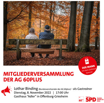 Die SPD AG 60plus trifft sich am Dienstag, dem 08.11.2022, um 17 Uhr, im Gasthaus „Adler“ in Griesheim zu ihrer diesjährigen Mitgliederversammlung und hat wieder einen Hochkaräter im Gepäck: Lothar Binding - Bundesvorsitzender der AG 60plus - wird zu Gast sein und mit seinem Vortrag zum Thema "Die Rentenwahrheit - und warum wir die Staatsschulden nicht unseren Enkeln überlassen" die Grundlage für eine Diskussion legen. Wer "den Mann mit dem Zollstock" schon einmal live und in Farbe erlebt hat, weiß, dass man sich auf einen spannenden, kurzweiligen Abend freuen kann! Beginn seiner Rede wird gegen 18:00 Uhr sein. Zum Vortrag sind auch Nicht-Parteimitglieder herzlich willkommen!