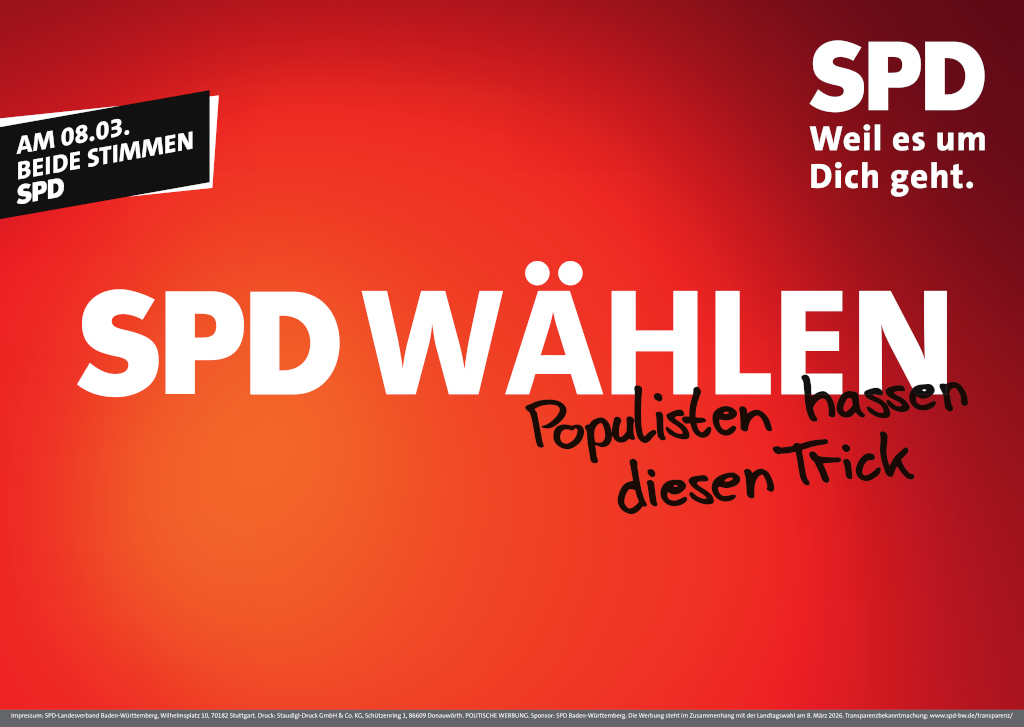 Damit unterstützt Du nicht nur aktiv den Wahlkampf der SPD in Baden-Württemberg, sondern setzt auch ein Zeichen für Haltung. Denn wir wissen: